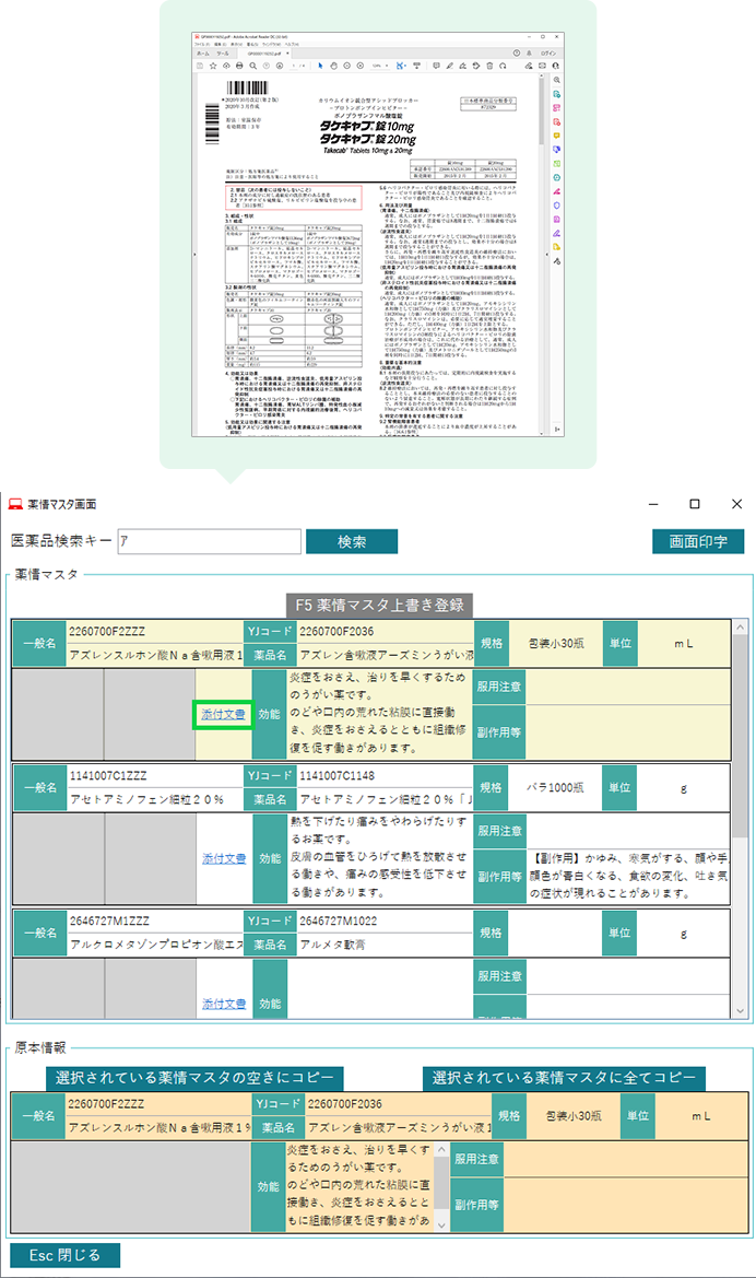 医薬品情報 画面では添付文書の要約内容が確認できます。また、<添付文書>のボタンを押せば添付文書を画面で確認でき、印刷することもできます。(Pharmy Connect(ファーミーコネクト)は約1万薬剤の添付文書を内蔵しています)