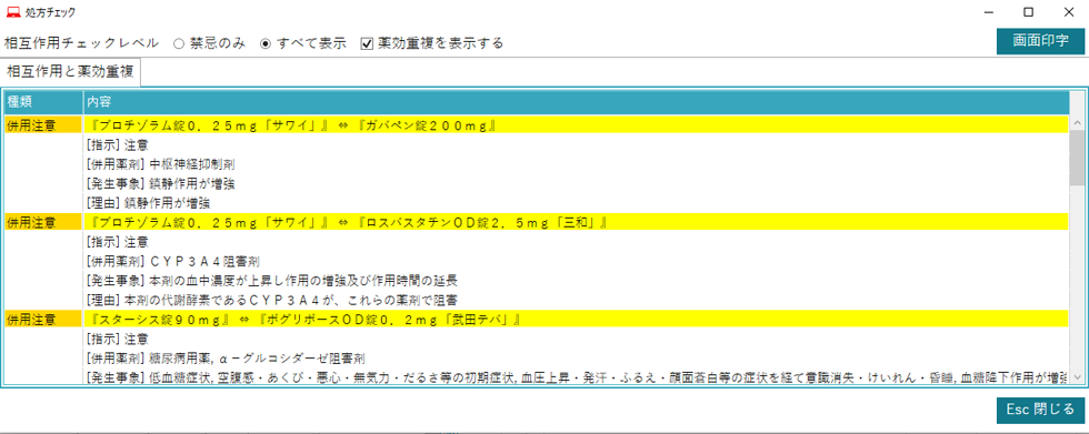 薬剤の相互作用や、同種薬効の重複投与チェックができます。
