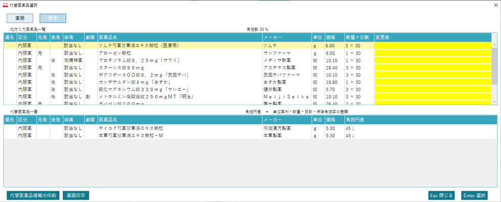 処方で使われている薬品の後発薬が一覧表示され、変更した場合に患者負担がいくら軽減されるかも表示されます。もちろん、患者さんに渡す<後発医薬品情報提供文書>も印刷できます。