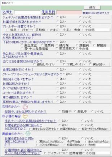 患者様にお願いする初回アンケートをタブレットPCを使って入力して頂く事ができます。入力された内容は薬歴への反映やプリントアウトが可能です。また、患者様に薬の使用方法等の動画を見せる機能もあり、これまで以上のサービスを患者様に提供できます。
