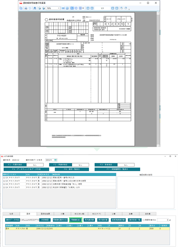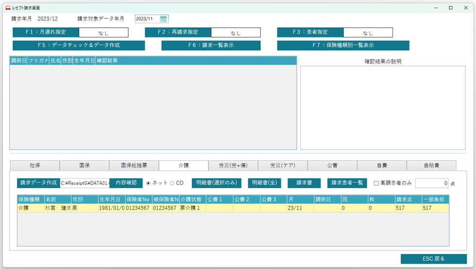 患者様の保険画面で介護保険を登録いただければ自動的に算定内容を医保請求分と介護請求分に分けて集計します。