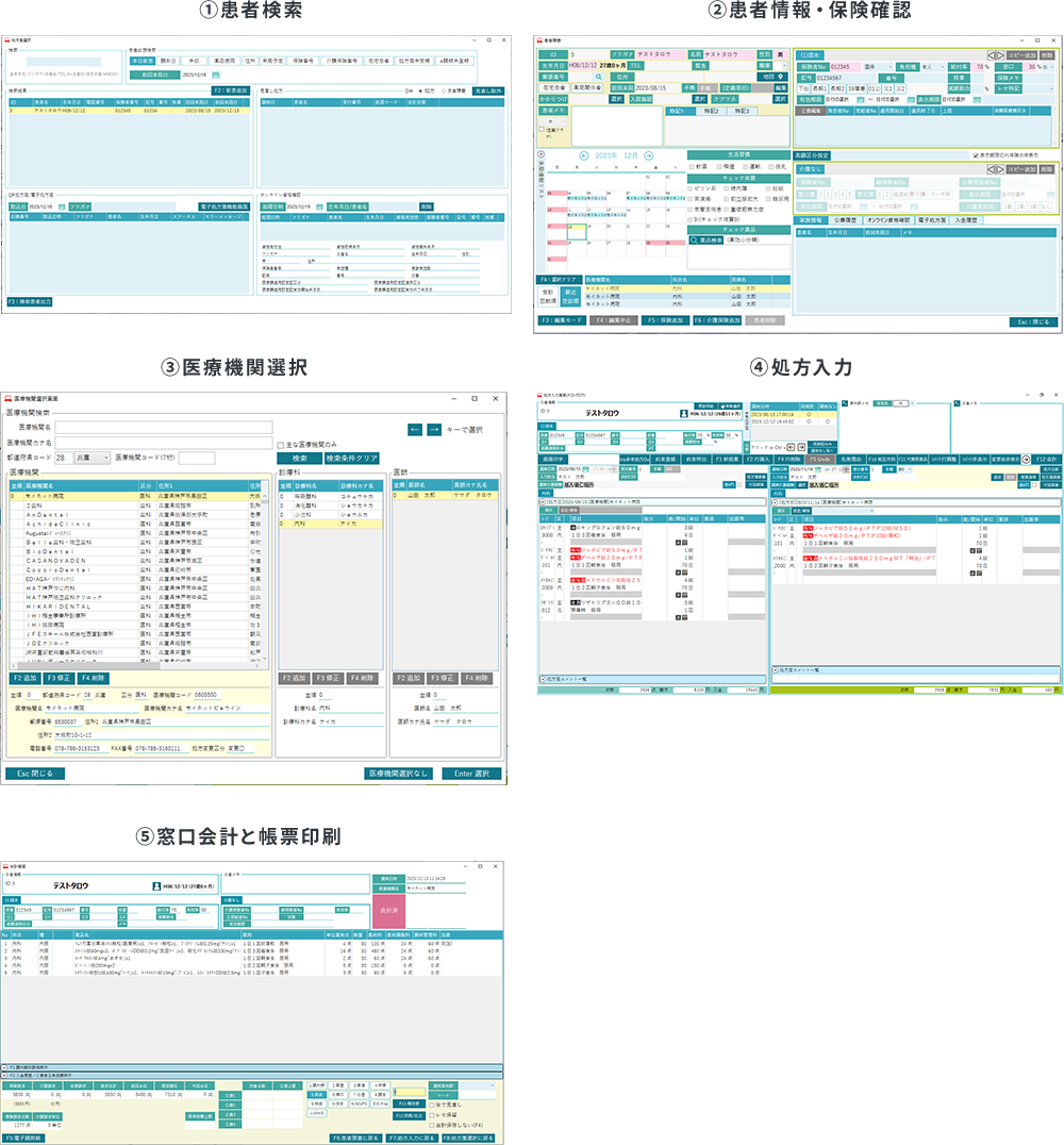 たった5つの画面が順番に表示され、患者選択から 処方入力 、窓口会計までの操作が一方通行でできます。多くの画面を表示・選択しないと次画面に行けず、どこに使いたい機能があるか迷い操作がわかりづらい...そんな悩みから開放されます。また、それぞれの操作は簡単で軽快です。