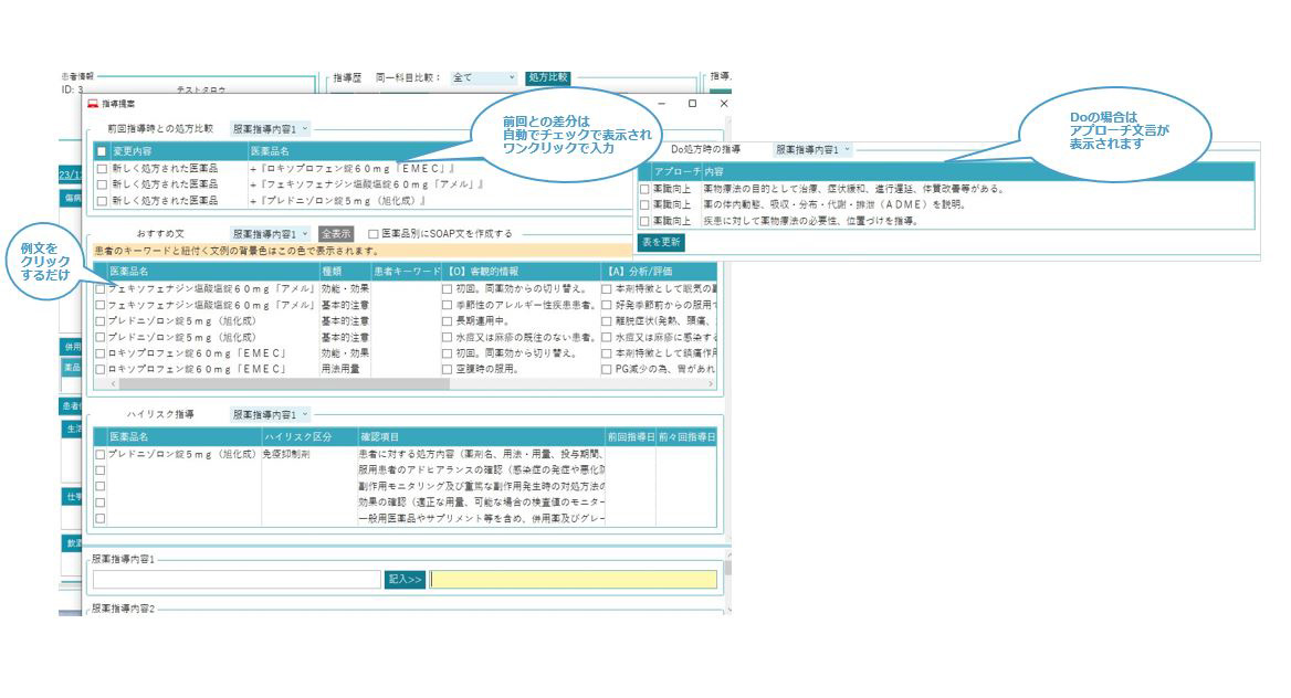 また、服薬指導においてポイント(前回比較差やDo処方時の話題など)が自動でサジェストされるので事前に内容を組み立てた上で服薬指導にむかえます。